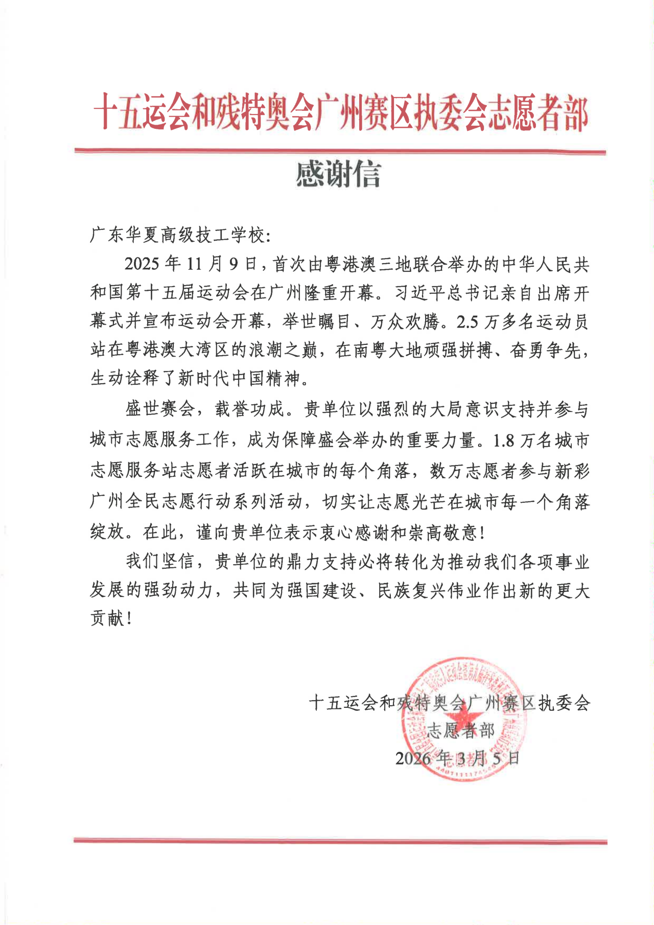 近日,我校收到十五运会和残特奥会广州赛区执委会志愿者部发来的感谢信。信中对我校在本届全运会从化赛区志愿服务工作中给予的大力支持、精心组织与辛勤付出表示衷心感谢。